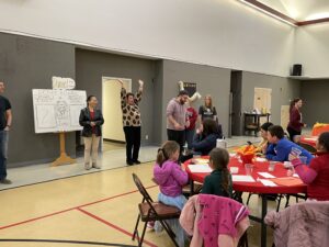All ages are invited to come eat their way through the Bible!  While we often indulge the kids a bit during dinner with a game or activity just for them, everyone is welcome and there is something for all ages and stages.  Young and old alike enjoy the fruits of the Garden of Eden, taste the stew of Jacob, work their way through the plagues, feast like David, and watch the loaves and fishes multiply!  The food, the décor, and the activities specifically align with that day’s scripture.